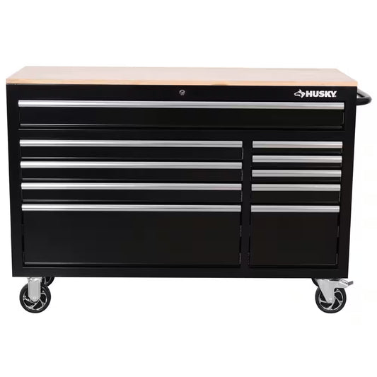 Standard Duty 72 In. W X 20 In. D 10-Drawer Gloss Black Mobile Workbench Cabinet with Solid Wood Top