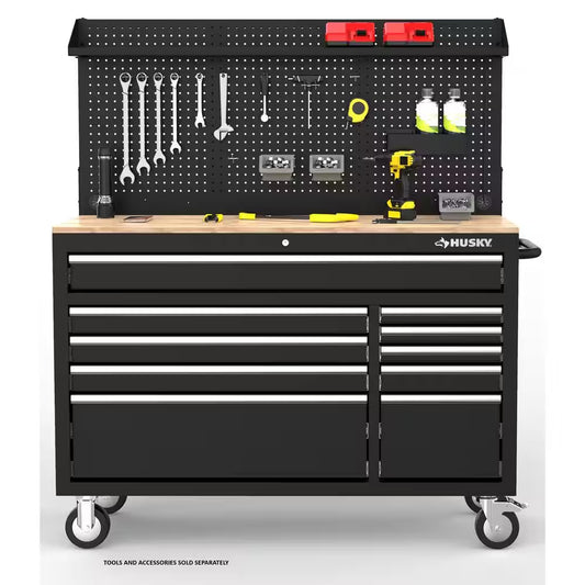 61 In. W X 26 In. D Heavy Duty 10-Drawer 1-Door Mobile Workbench with Hardwood Top, Pegboard and Shelf in Matte Black